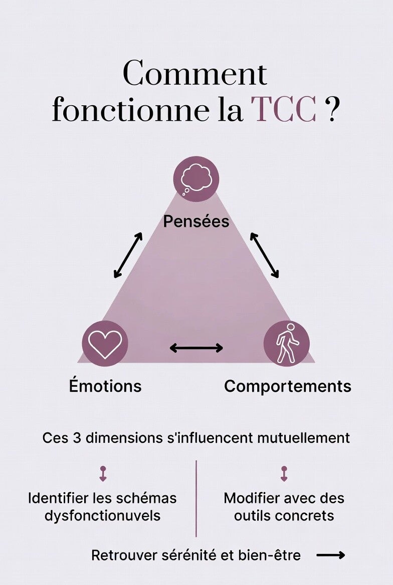 La TCCE aide à réduire la souffrance émotionnelle en agissant sur trois dimensions étroitement liées : les pensées, les émotions et les comportements.